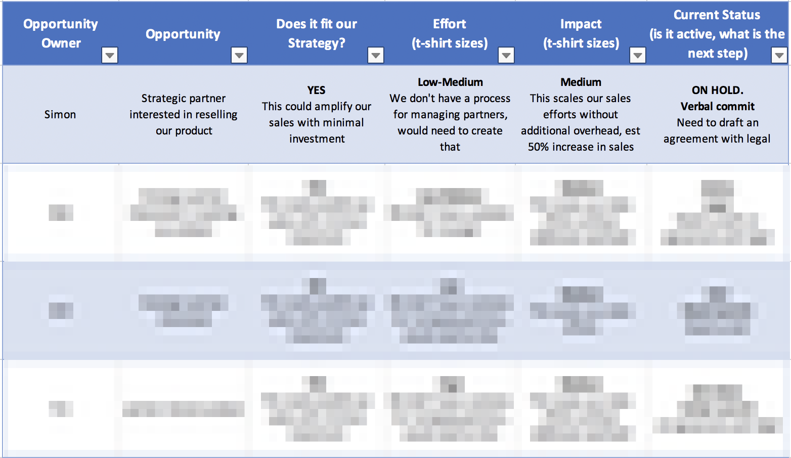 No matter the stage of business, there are inevitably decisions to be made with finite resources. How you evaluate one strategic opportunity over another can help determine where to spend that time - to hopefully spend it wisely. Tracking opportunities requires focus on the right ones, an approach to evaluation of one opp against another, and how the business accesses and shares this information to build alignment. Your team likely has a CRM to work funnel opportunities, but tracking of the strategic opportunities is much less standardized. This post explores a framework to both simplify and standardize the tracking of those opportunities.
